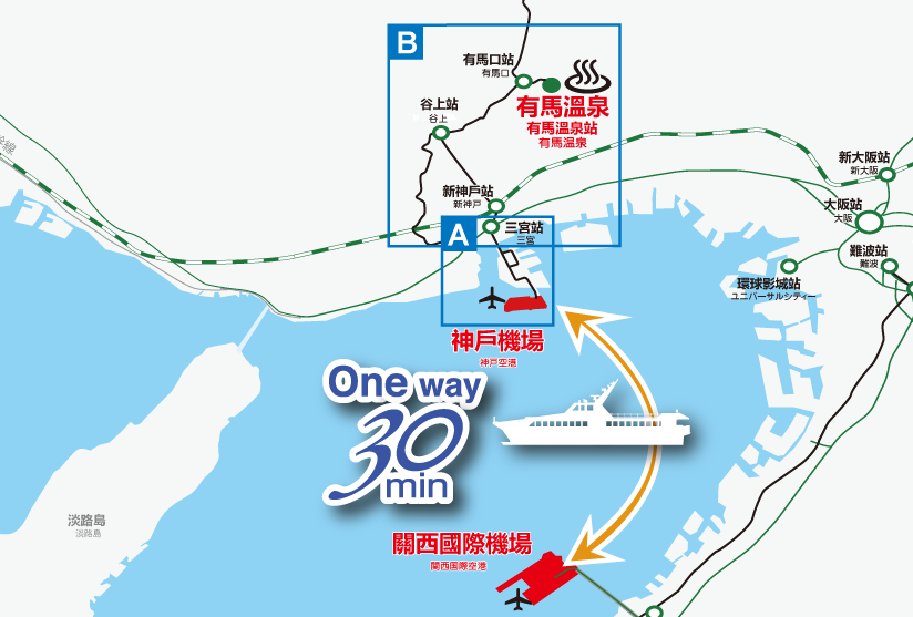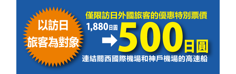 神戶高速船(Bay Shuttle)是關西機場到神戶機場的海上交通工具。要前往神戶市區的旅客,可以在神戶機場轉乘自動駕駛膠輪電車系統「港灣人工島線」到三宮站,全程最快只要 60 分鐘,是關西機場到神戶所需時間最短的交通工具。神戶高速船還推出了外國旅客專用的優惠船票,單程只要 500 日圓。所以要從關西機場到神戶的旅客,神戶高速船是最省時划算的選擇。