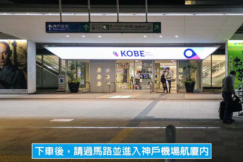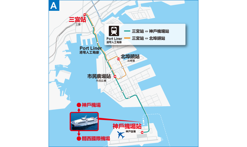 搭乘神戶高速船抵達神戶機場後,請下船並依指標穿越碼頭棧橋和候船大廳,就會看到往返神戶機場的免費接駁巴士。下車後,請過馬路並進入神戶機場航廈內,並依照「ポートライナー連絡口」(港灣人工島線連通道)、「PORTLINER」、「港區捷運」等指標,搭乘大門左右兩側的電扶梯或電梯到二樓,就會看到港灣人工島線的機場連通道入口。
