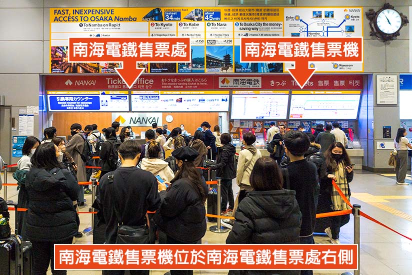 下機後請依循「到著」(抵達)指標搭乘航廈內接駁電車至入境審查處並領取行李,接著依循「鐵道」標示搭乘電扶梯至 2F,再穿越戶外天橋,就會進入關西機場車站大廳。繼續向前走,就會在左手邊看到橘色及紅色招牌的「NANKAI Ticket Office」,此即南海電鐵售票處。
