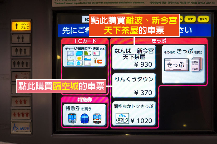 售票機位於南海電鐵售票處旁邊。若要購買空港急行車票,請直接點選售票機螢幕上的「なんば(難波)、新今宮、天下茶屋」,再輸入張數並付款取票。
