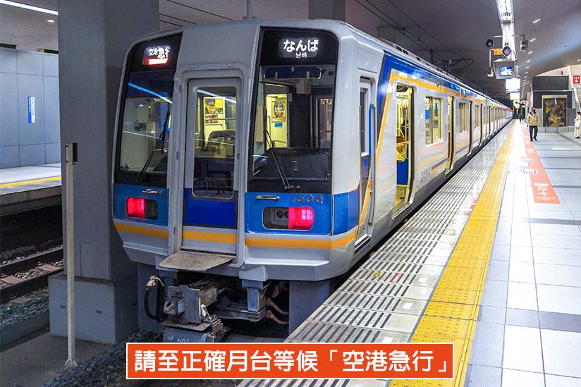 南海電鐵售票處對面的橘色招牌就是南海電鐵車站閘門,請將空港急行車票或關空地鐵套票放進閘門並取回。進站並下樓後,就會立刻看到月台。月台上的列車資訊電子看板會顯示即將到站的車種、車次及時間,候車時請特別留意,不要搭到「Rapi:t」。