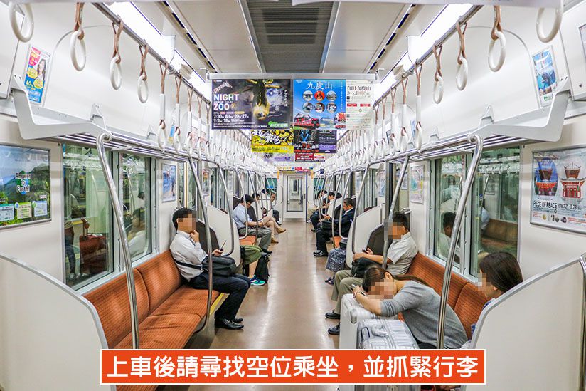 空港急行全車不劃位且沒有大型行李架,所以上車後請自行尋找空位並抓緊行李。車門上方的螢幕會顯示目前位置及到站名稱,請隨時緊盯以免坐過站。