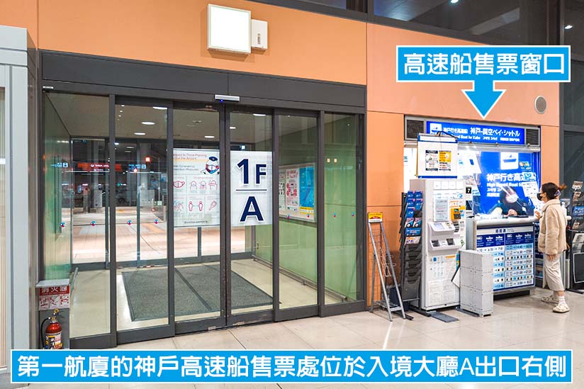 抵達第一航廈的入境大廳後,請依照自動門上的標示找到「A 出口」,就會在門口右側看到神戶高速船的售票處。請出示護照以購買外國旅客優惠船票。