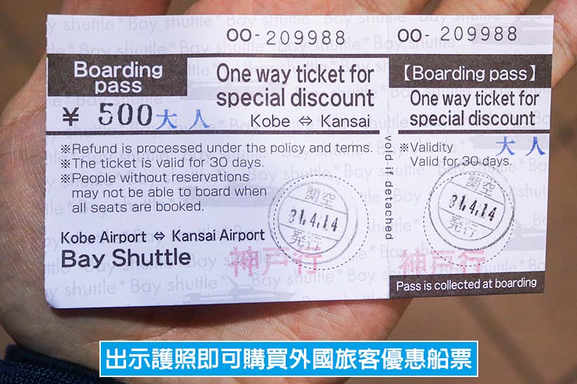 神戶高速船的單程票價為成人 1880 日圓,兒童(6~12 歲)940 日圓。不過,神戶高速船推出了超級划算的外國旅客優惠船票,在售票處出示護照即可購買,成人只要 500 日圓,兒童(6~12 歲)250 日圓。但外國旅客優惠船票不包含神戶機場到三宮的「港灣人工島線」車資,需要自行購票搭乘,單程票價為 340 日圓,兒童(6~12 歲)170 日圓。所以外國旅客從關西機場到神戶市區(三宮)的神戶交通船+港灣人工島線費用總共是 840 日圓。