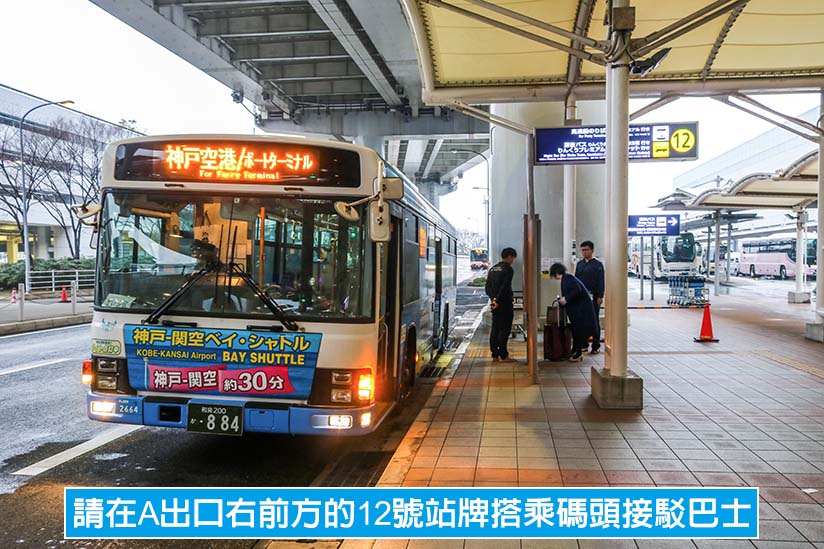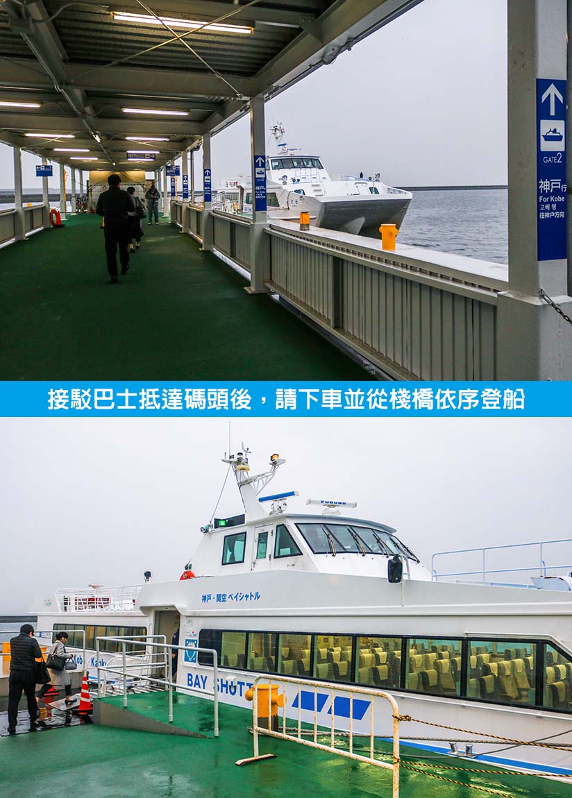購票完成後,請從 A 出口離開入境大廳,就會立刻在右前方看到碼頭接駁巴士停靠的 12 號站牌,出示船票即可免費搭乘。搭乘接駁巴士約十分鐘,就會抵達神戶高速船的關西機場碼頭。下車後,請按照指標依序從棧橋登船。