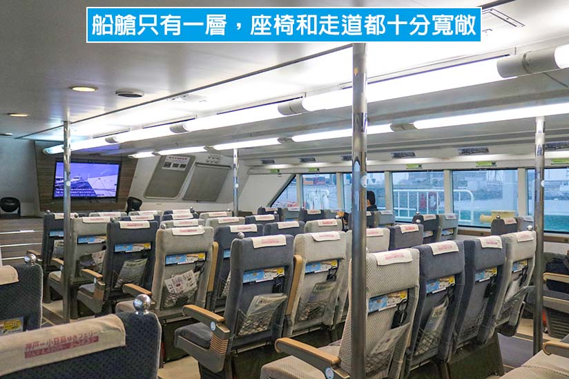 神戶高速船的船艙只有一層,內部空間與飛機類似,但座椅和走道更為寬敞。船艙出入口旁設有大型行李放置區,後方也有廁所可使用。從關西機場出發後,大約 30 分鐘就會抵達神戶機場碼頭。