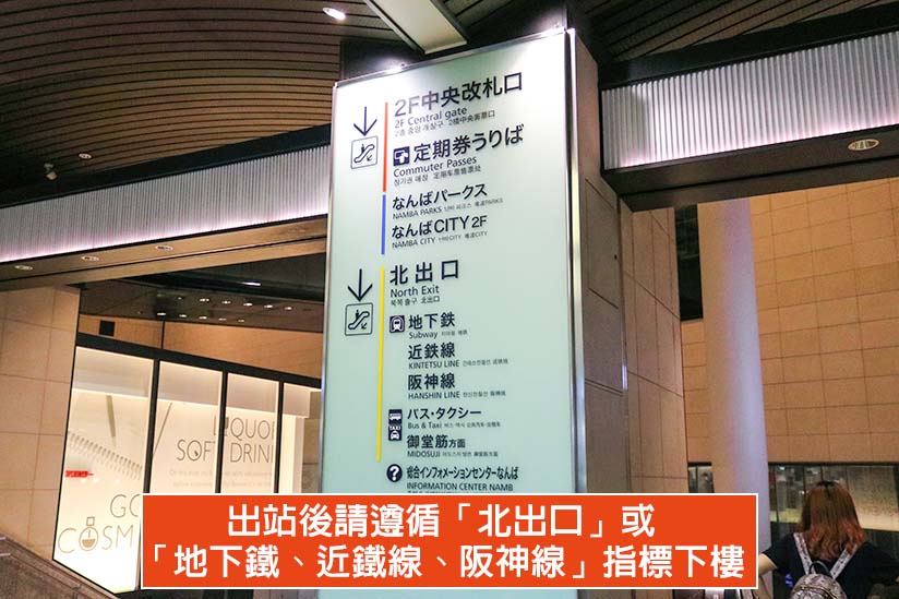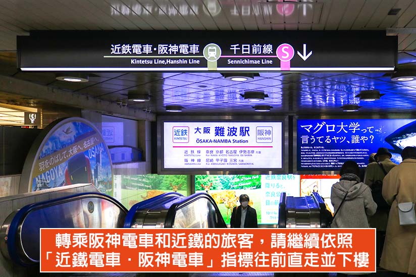 抵達南海電鐵難波站後,請先出站並遵循「北出口」或「地下鐵、近鐵線、阪神線」指標下樓,就會看到大阪地鐵的「難波站」(なんば)與近鐵‧阪神電車的「大阪難波站」連通道。請繼續依照「近鐵電車‧阪神電車」指標往前直走並下樓,就會抵達兩業者共用的「大阪難波站」閘門。請先到近鐵售票機購買單程車票或感應 ICOCA,即可進站搭乘開往奈良的近鐵。