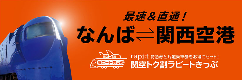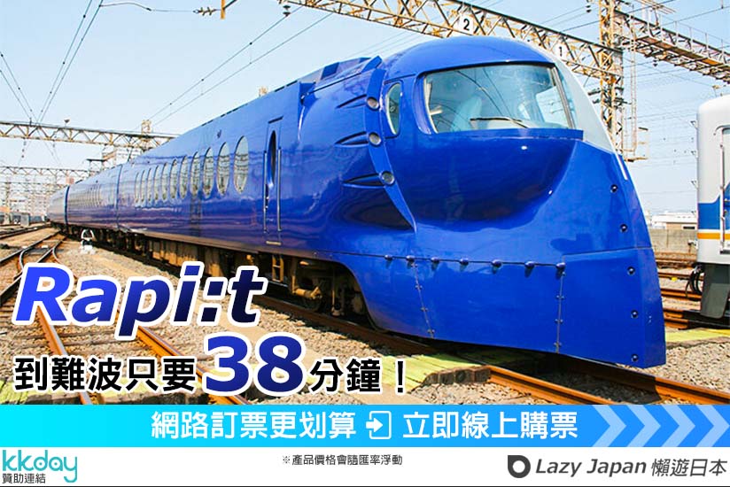 「Rapi:t 特急」(以下簡稱 Rapi:t)是南海電鐵所推出的機場高速特快車,從關西機場出發後,Rapi:t 會沿南海本線行駛至天下茶屋、新今宮及南海電鐵難波站,最快只要 35 分鐘,就能直接從關西機場到難波、道頓堀、心齋橋,不必轉乘。所以要從關西機場到大阪市區或難波的旅客,十分適合搭乘 Rapi:t。