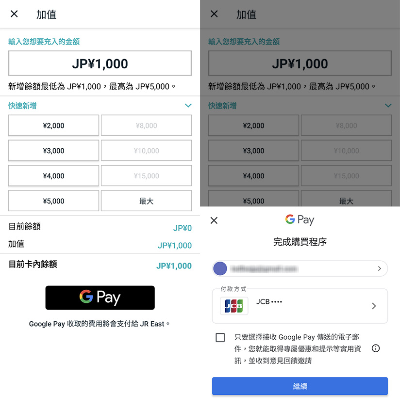 請點選「新增 Suica」,接著輸入最低儲值金額(1000 日圓)並按下 Google Pay 按鈕,就會出現您已在 Google 錢包或 Play 商店綁定的信用卡列表。由於 Android 平台的虛擬版 Suica 在日本海外只能透過 JCB 信用卡交易,台灣各家銀行的 Visa 或 Mastercard 都會被拒絕。所以結帳時,請點選付款方式>新增信用卡>輸入或掃描您的 JCB 信用卡資料,才能完成虛擬版 Suica 的加值程序。