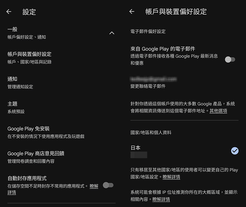 ◆您可以等到日本旅遊時再進行設定,或是先在台灣透過 VPN 連接到日本的伺服器,並使用全新註冊的 Google 帳號登入手機上的 Play 商店,接著產生一筆日幣消費帳單(無須付款)。完成後到 Play 商店的設定選單中確認,就會看到您的 Google 帳號被綁定在日本地區(打藍勾)。網路上已有許多日本版 Google 帳號的註冊教學,所以懶懶哥就不在此詳述,如需詳細操作流程請點此查詢。