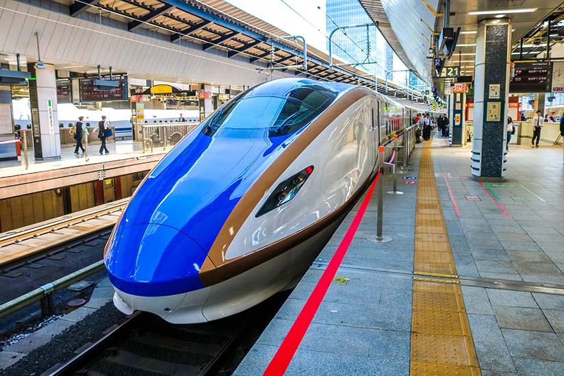東京車站~輕井澤車站的北陸新幹線行駛時間約 60~70 分鐘,班距約 20~60 分鐘,單程票價為 5490 日圓(自由席)~6020 日圓(指定席/對號座)。
