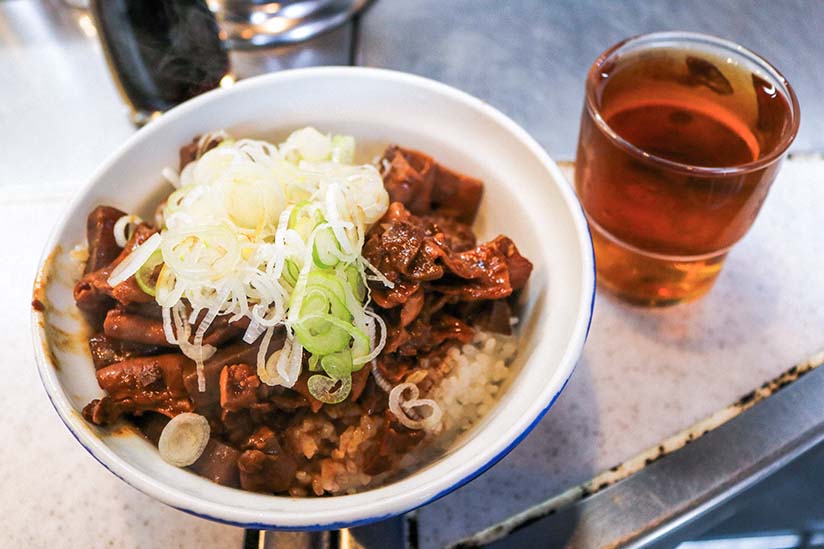 放下緊張心情的懶懶哥,趕緊動筷品嚐眼前的牛雜丼。深棕色的牛內臟滷得鬆綿,醬汁微鹹不膩,還拌入了 Q 彈的蒟蒻條點綴。但內臟入口後苦味明顯,而且質地過於軟爛,白飯也煮得濕黏,整體來說不太合懶懶哥胃口。不過,相較於鹹度跟甜度都偏高的牛丼,牛雜丼的醬汁溫和許多,台灣人應該比較能接受。